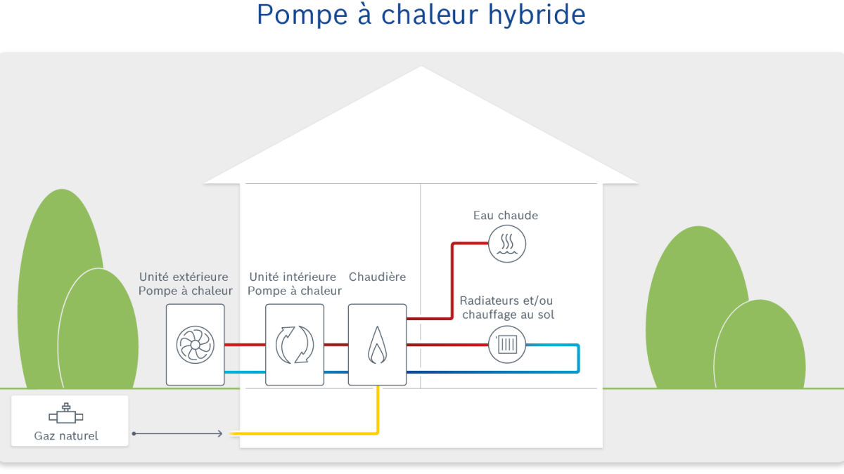 - Meilleure efficacité énergétique : Une chaudière hybride combine les avantages d'une chaudière à gaz traditionnelle (présente dans de nombreux logements) avec ceux d'une pompe à chaleur perfectionnée. La pompe à chaleur utilise la chaleur de l'environnement pour chauffer un logement. Ce double dispositif d'apport de chaleur permet une plus grande efficacité énergétique.