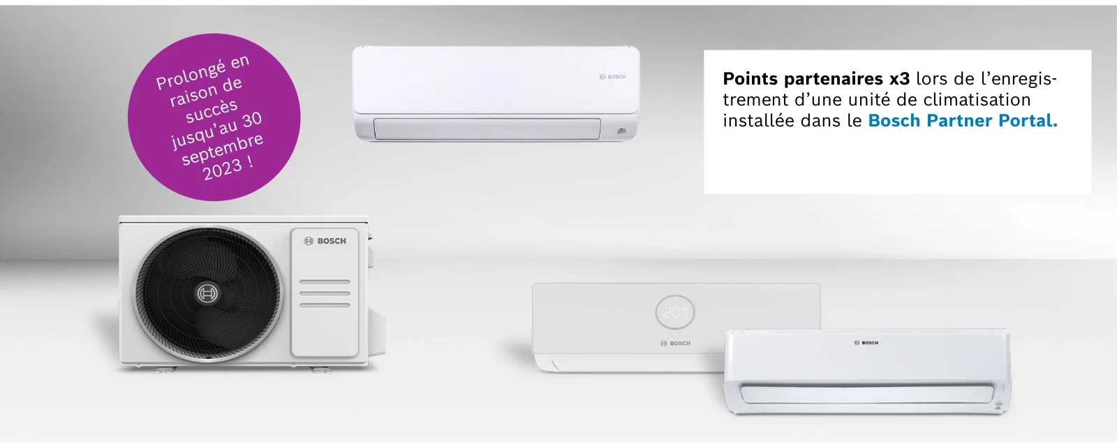 Désormais, 3x plus de points partenaires lors de l'enregistrement d'une unité intérieure de climatisation Bosch dans le Partner Portal, jusqu'au 30 septembre 2023.