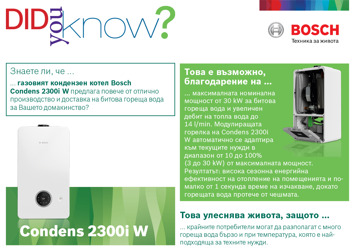 От месец декември 2010 Bosch разширява предлаганата на българския пазар гама с кондензни газови котли с мощност 65 и 98 kW. Те предлагат модерно отоплително решение за едно- и многофамилни къщи, многоетажни сгради за жилищни или търговски цели. Те дават възможност и за изграждане на каскадни инсталации от 2 до 16 котела или постигане на мощности до 1 568 kW.
