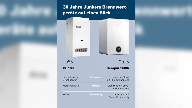 Mit der CL100 fing alles an. Vor 30 Jahren gingen bei Junkers die ersten Brennwertgeräte für Deutschland in Serie. Zwischen damals und heute liegen Welten, wie der Vergleich der CL 100 mit der aktuellen Geräteserie Cerapur 9000i zeigt. (Quelle: Junkers)