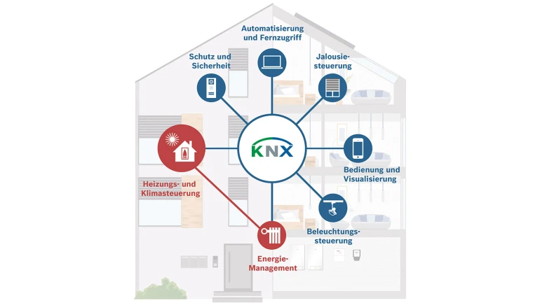 Gas- und Ölheizungen sowie Wärmepumpen von Junkers Bosch, die mit dem EMS2-Regler und einem Internet-Gateway ausgestattet sind, lassen sich über den Router und das KNX 10 mit dem KNX-Bus verbinden. Weil die Komponenten untereinander kommunizieren, übernehmen KNX-Systeme auf Wunsch die Heizungsregelung vollständig und gewährleisten so einen effizienten Betrieb mit einer Energieeinsparung von bis zu 40 Prozent. Zudem schützt der dezentrale Aufbau das KNX-System vor Störungen: Der Ausfall einer Komponente hat keine Auswirkung auf die Funktion der anderen.