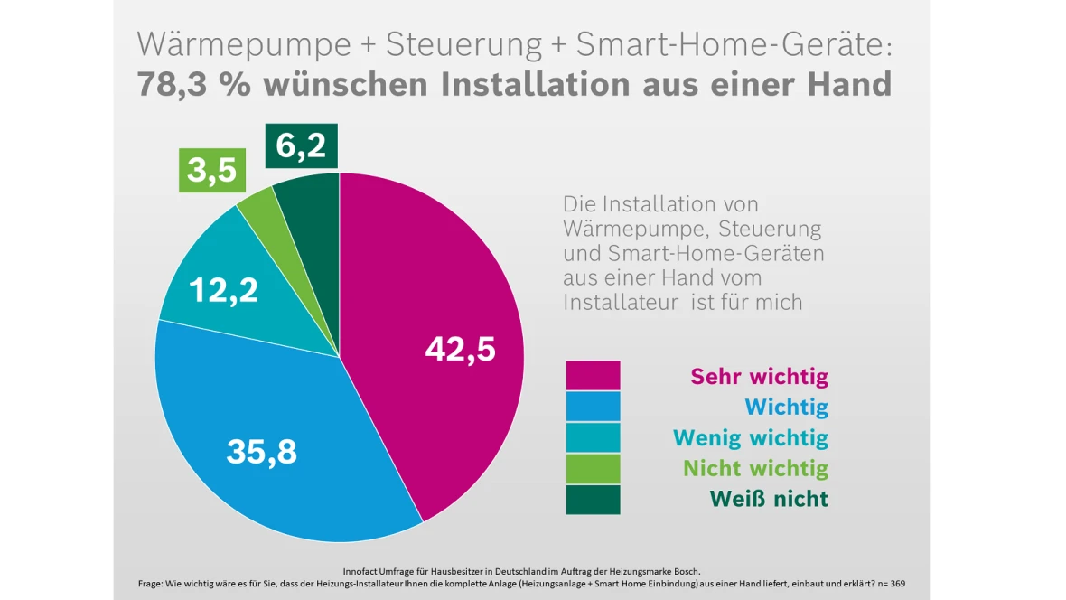 Die neue Wärmepumpe ist installiert. Die Temperatur lässt sich bequem per Smartphone steuern und alle Verbraucher im Haus werden in der App angezeigt. Eine intelligent gesteuerte Energieversorgung macht das Energiesparen einfach. Vor dem Neubau oder der Modernisierung steckt der Teufel manchmal aber im Detail. Sind die Komponenten wirklich kompatibel? Welches Gerät versteht sich mit welcher App? Lässt sich die neue Heizung wirklich smart steuern? Die große Mehrheit der Eigentümer von Häusern oder Wohnungen möchte, dass der Fachinstallateur die vollständige Installation der smarten Heizungslösung aus einer Hand übernimmt. Wie eine repräsentative Innofact-Umfrage im Auftrag der Heizungsmarke Bosch zeigt, ist für 78,3 % der Eigentümer eine Lösung mit nur einem Ansprechpartner wichtig. Für nur 3,5 % spielt die Installation durch einen Fachmann überhaupt keine Rolle. „Die Ergebnisse zeigen, dass der Fachinstallateur ein wichtiger Ansprechpartner ist, wenn es um den Neubau oder die Modernisierung einer smarten Heizung geht“, erklärt Dr. Alexander Wuthnow, Vertriebsleiter Bosch Junkers Deutschland, Schweiz und Luxemburg. „Durch umfangreiche Schulungen und moderne digitale Techniken können sich Heizungspartner darauf verlassen, dass smarte Heizungen von Bosch einfach installierbar und erweiterbar sind. Bei allen Fragen sind unsere technischen Berater und der Werkskundendienst nur ein Klick auf die App oder ein persönliches Telefonat weit entfernt. Mit diesem kompetenten Netzwerk wird der Bosch Heizungspartner für seine Kunden der gewünschte Ansprechpartner für Lösungen „Aus einer Hand“.