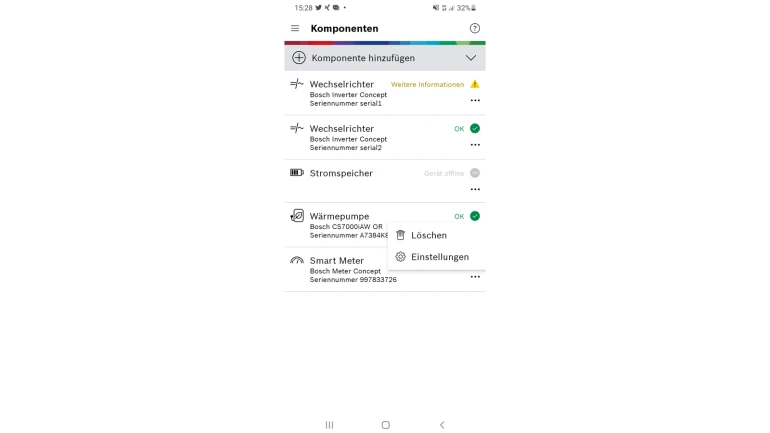 - Sollte der Fehler weiterhin bestehen, überprüfen Sie bitte den Online Status der Wärmepumpe unter "Mehr"→ Komponenten