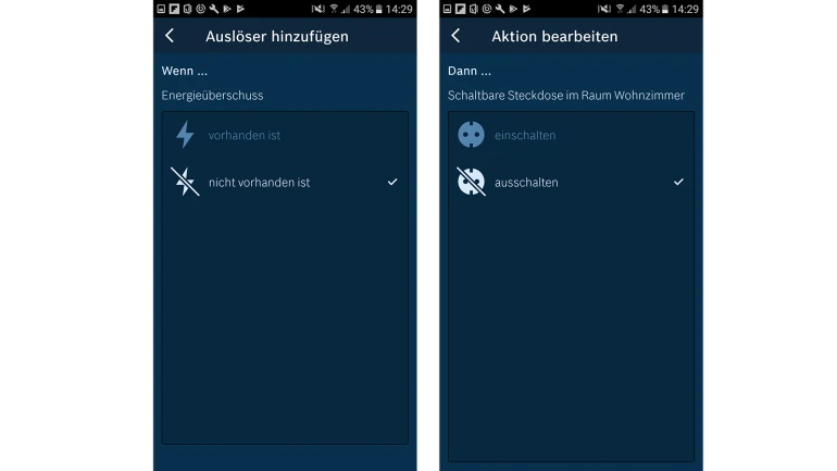 Neben einer Automationsregel für das Zuschalten ("Auslöser Energieüberschuss - vorhanden") ist für diese Anwendung eine zweite Regel zum Abschalten nötig. Auslöser ist hier "Wenn" "Energieüberschuss - nicht vorhanden ist", "Dann" "Zwischenstecker - aus".