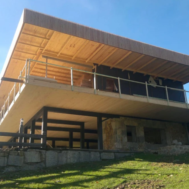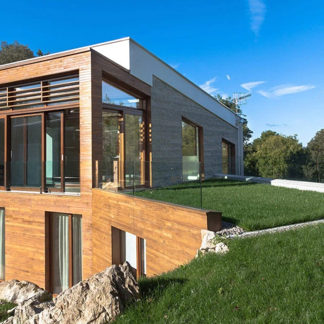 Elaborada en madera, hormigón pulido para el suelo y celulosa como aislante, cuenta con diferentes sistemas de energía renovable, como placas solares fotovoltaicas y ventilación natural. Además, tiene una caldera eléctrica individual para momentos puntuales.