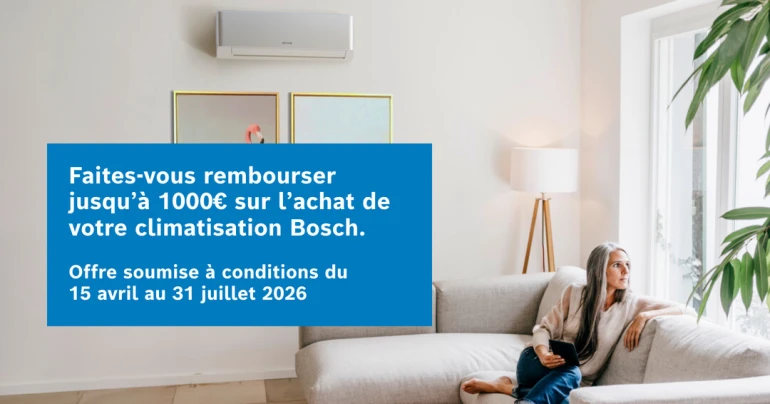 Du 15 avril au 31 juillet 2026, bénéficiez d’une offre de remboursement exceptionnelle pouvant aller jusqu’à 1000 € pour l’achat d’un système de climatisation Bosch. Cette offre est réservée aux particuliers et s’applique à l’ensemble des gammes de climatisation résidentielles Bosch.