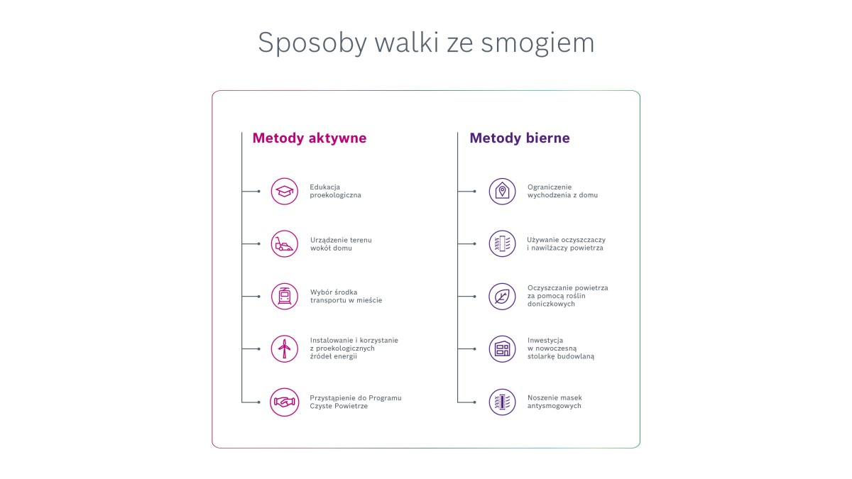 Jedne metody pomagają zredukować poziom smogu i przeciwdziałać jego emisji.. Inne stanowią formę obrony przed tym szalenie niekorzystnym dla naszego zdrowia zjawiskiem. Można więc uznać, że pierwsze z nich są sposobami czynnymi, aktywnymi, a drugie – biernymi i pasywnymi.