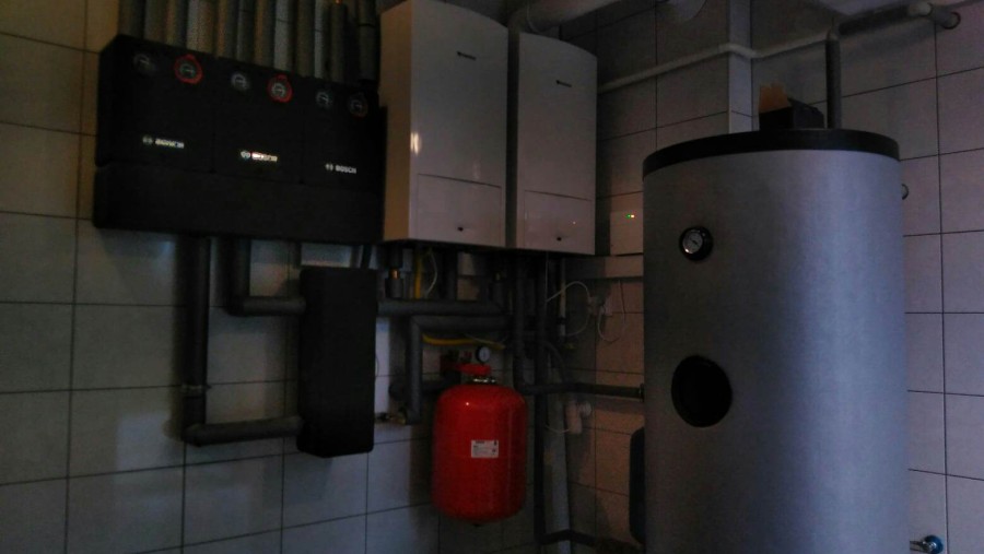 Gazowe kotły kondensacyjne 2x Junkers Cerapur Smart 24 kW działające w kaskadzie wraz z modułem kaskadowym i regulatorem CW400, grupy pompowe Bosch ze sprzęgłem hydraulicznym.