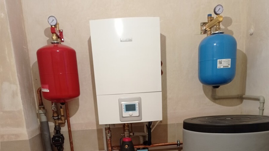 Zamontowano pompę Bosch Compress 3000 AWS 8 ze zbiornikiem buforowym i zbiornikiem c.w.u. Pompa pracuje z jednym obiegiem grzewczym. Całość oparta na ogrzewaniu podłogowym.