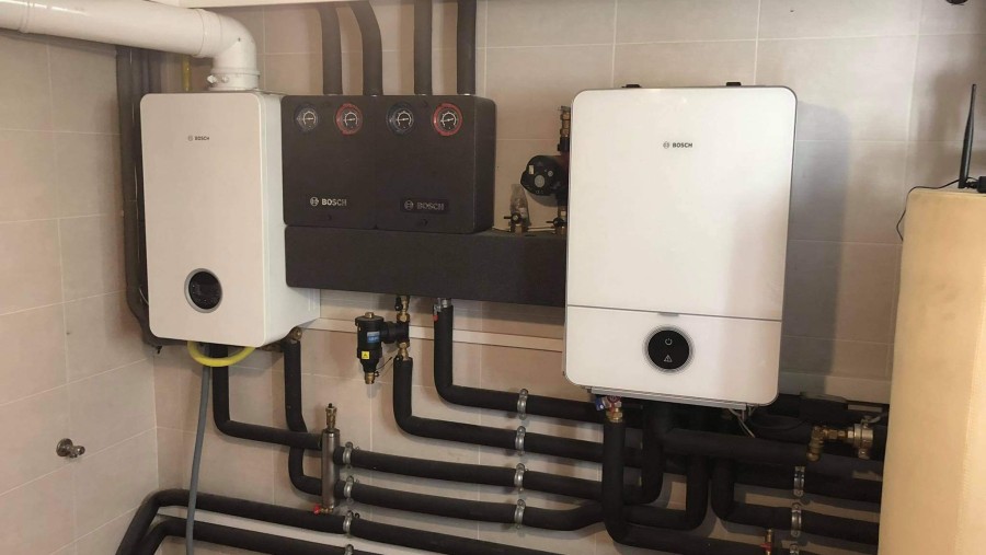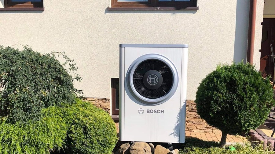 Powietrzna pompa ciepła typu monoblok Compress 7000i AW marki Bosch oraz gazowy kocioł kondensacyjny Bosch Condens 2300i W, zainstalowane w modernizowym domu jednorodzinnym.