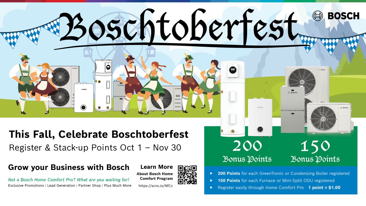 Bosch is bringing the spirit of Oktoberfest to you with Boschtoberfest! From Oct. 1 through Nov 30., every eligible product you register in the Home Comfort Pro program earns you extra bonus points. More registrations mean more rewards in your account, it’s that simple.